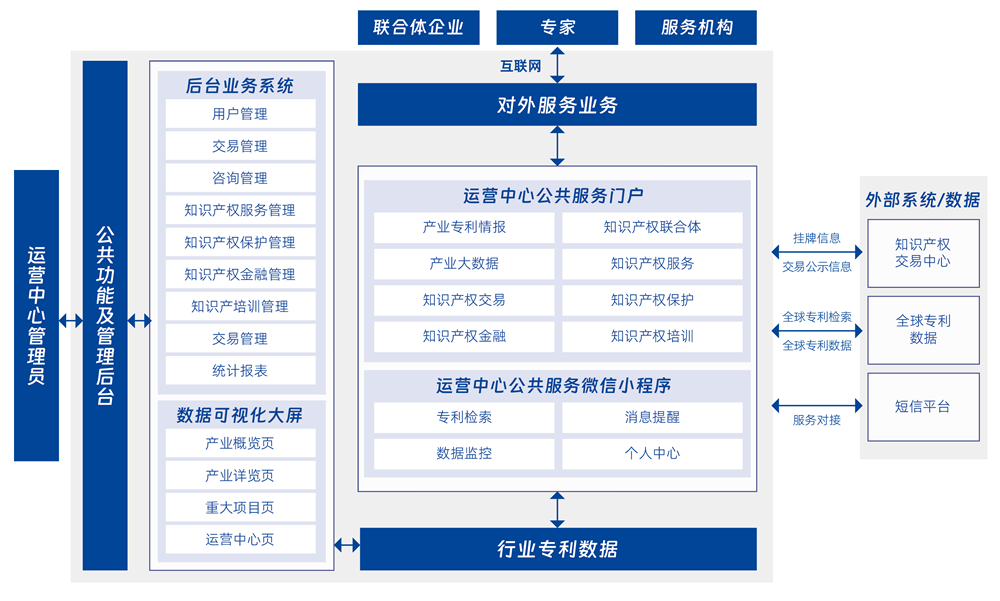 产业知识产权运营支撑平台以数字化创新技术辅助提升产业知识产权创造、、、、运用、、保护、、管理和服务水平,,平台采用“一库四中心”模式,,,,即产业专利专题库和数字支持中心、、创新服务中心、、运营交易中心、、、交流合作中心,,采用数字化驱动产业知识产权运营,,,,推动产业知识产权多元化保护,,支撑推动开发许可落地实施,,,,多渠道推动产业运营高质量发展,,,,持续构建多放共赢的产业运营生态圈。。。