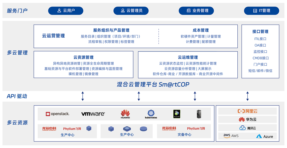 面向各行业用户多云资源管理、、、运维及服务提供的综合挑战,,,,提供异构异地异芯片多云资源的统一管理、、、、统一运维、、、、统一监控及统一运营服务,,,,简化多云管理复杂度,,提升用户用云满意度,,,,释放云平台业务价值。。。