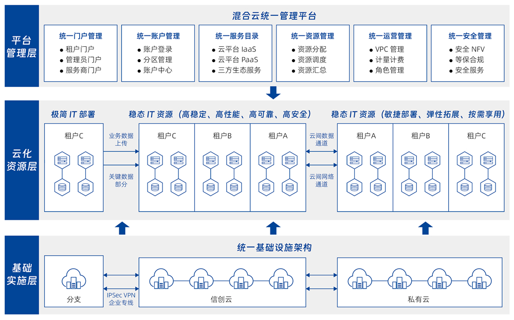 面向已部署多云、、、信创基础设施的行业用户,,提供自助化、、、、自动化的云服务快速交付服务。。。。管理企业内部多个数据中心的物理、、虚拟资源,,,以及容器、、私有云、、、公有云资源,,,,并对以上资源进行混合编排,,,提供基础软件和应用软件的自动化部署服务,,,,以及云资源的全生命周期管理。。。
