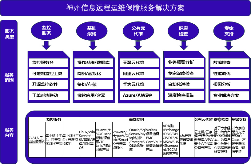 依托7×24小时智能监控中心、、、、专业化运维管理平台及资深级技术专家团队,,,构建三位一体的远程运维服务体系,,提供包括对公有云、、、私有云、、、机房、、、网络、、、、服务器、、操作系统、、、存储、、备份、、数据库、、、中间件、、应用、、、安全等ICT基础设施的远程保障服务。。。。为客户数字化转型、、、、人工智能、、、云计算、、物联网、、区块链、、数字资产等前沿技术领域保驾护航,,,,驱动客户数字创新进程。。。。
